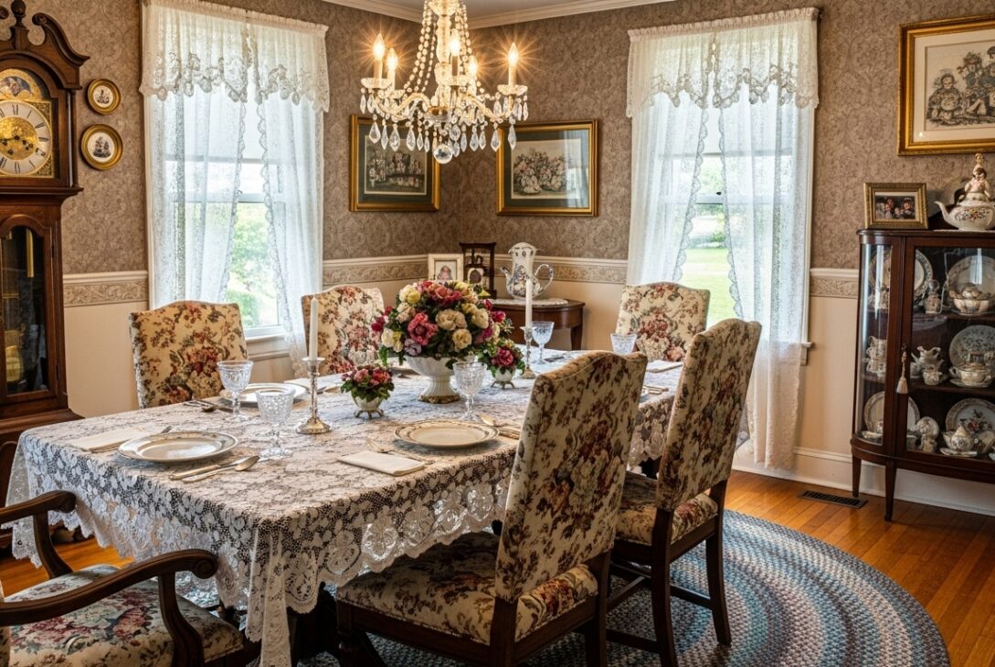 Matching chair sets exist, sure, but classic grandma dining room décor quietly prefers near-matching. Same wood tone, slightly different backs. One chair always squeaks. Nobody fixes it. That’s the chair people recognize blindfolded.