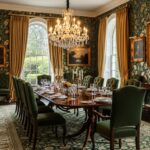Lighting is never harsh. Chandeliers hang a little lower than modern rules suggest. Lamps appear in dining rooms more often than expected, usually on sideboards. Shades are fabric, not glass.