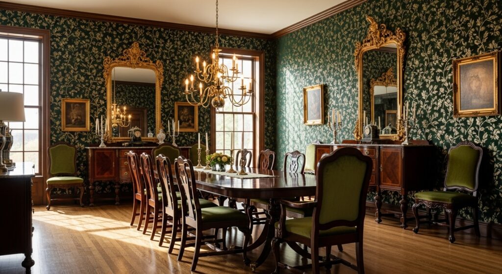 Historic preservation data shows traditional dining rooms often used darker greens paired with gold leaf or metallic paint to hide candle soot and wear. That practical origin gives these patterns an authenticity modern prints sometimes lack.