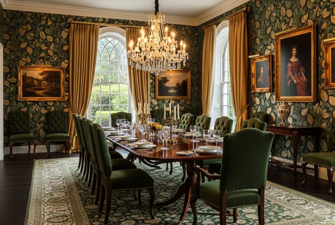 Historic preservation data shows traditional dining rooms often used darker greens paired with gold leaf or metallic paint to hide candle soot and wear. That practical origin gives these patterns an authenticity modern prints sometimes lack.