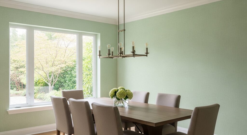 Dining rooms get messy. Steam, spills, hands touching walls while chairs move. Light green shows dirt differently than white. Less harsh, but more persistent. Washable finishes matter here. Matte beats satin almost every time.