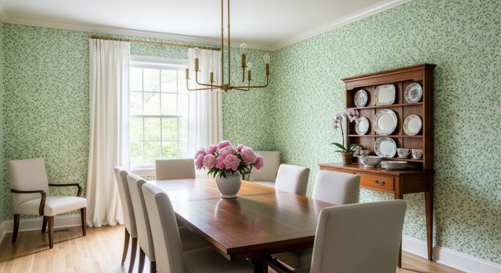 Color preference surveys show warm light greens score high for compatibility with multiple décor styles. People don’t feel boxed in by it. They change chairs. Swap tables. The wallpaper stays.