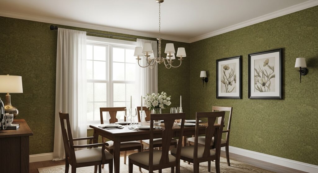 Some olive wallpapers tilt brown, especially under warm bulbs. That shift matters. The dining room starts reading heavier. Tables look thicker. Chairs seem closer together even when they’re not. Spatial perception research shows mid-to-dark earthy greens can compress perceived space by several percent, which explains why dinners in these rooms feel more focused, less scattered.