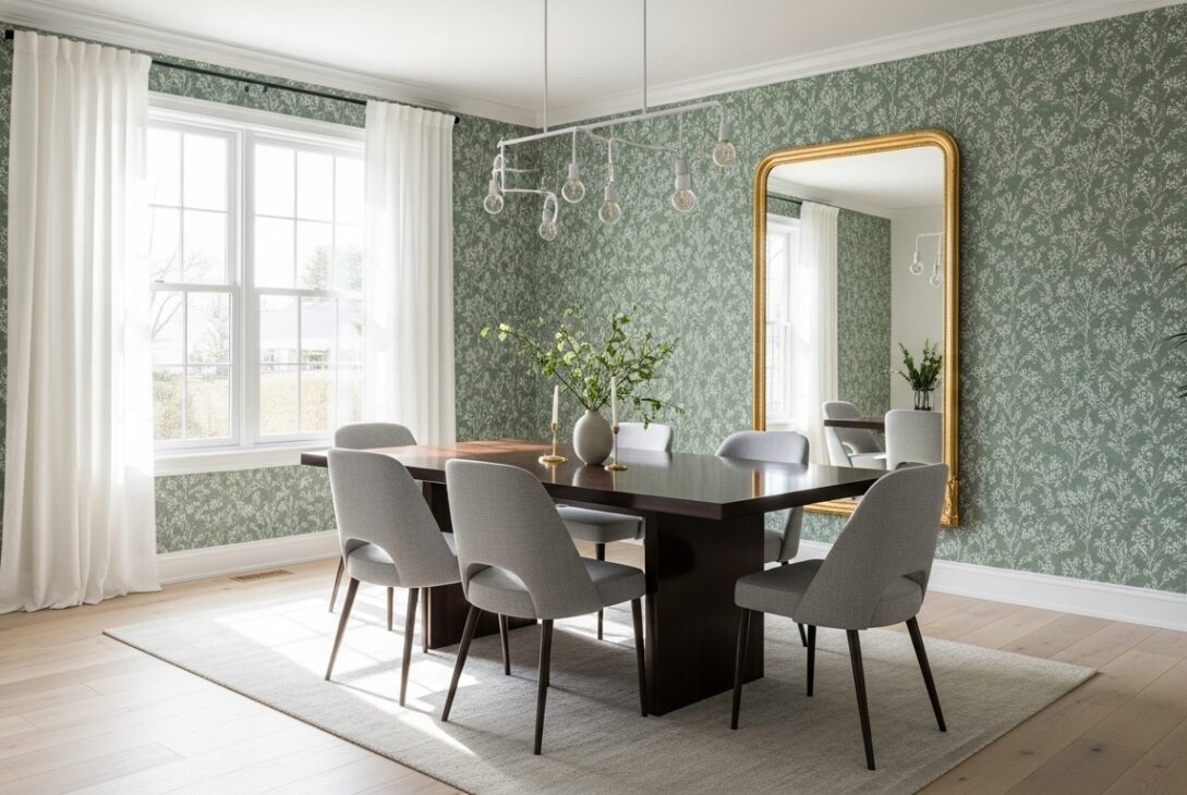 You land on sage green dining room wallpaper ideas thinking you’re choosing neutral, the sensible option, the grown-up move. Sage sounds polite. Sage sounds like it won’t argue with your table or your chairs. And then the wallpaper goes up and suddenly the room has a temperature. Not literal, but emotional, like it’s deciding how long people should stay after dessert.