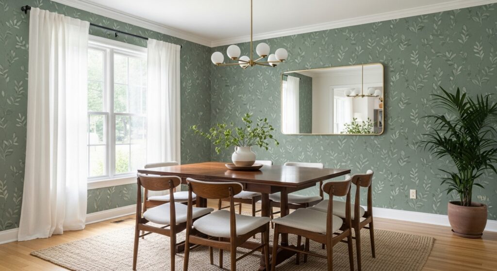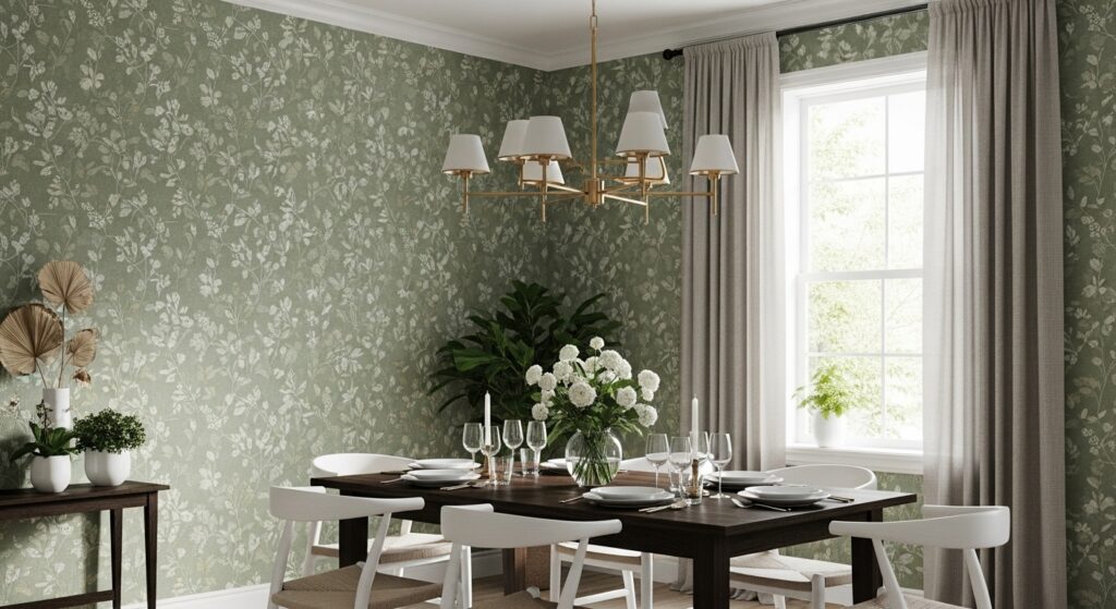 Sage green dining room wallpaper patterns often play a quiet game. From across the room, they look solid. Up close, vines appear. Lines repeat. Shapes overlap. That subtlety is what keeps people interested longer. Medium to low contrast patterns have been shown to reduce visual fatigue compared to high-contrast designs, which helps explain why sage wallpaper tends to age well.