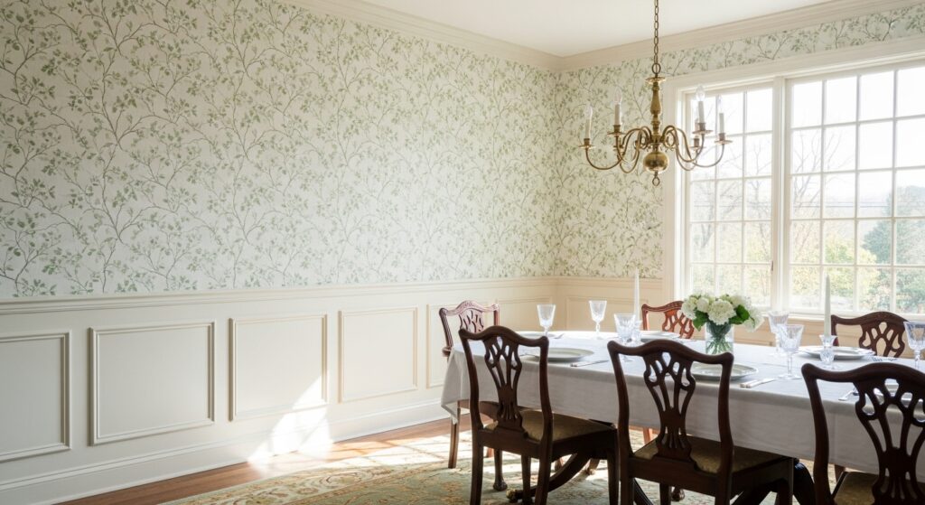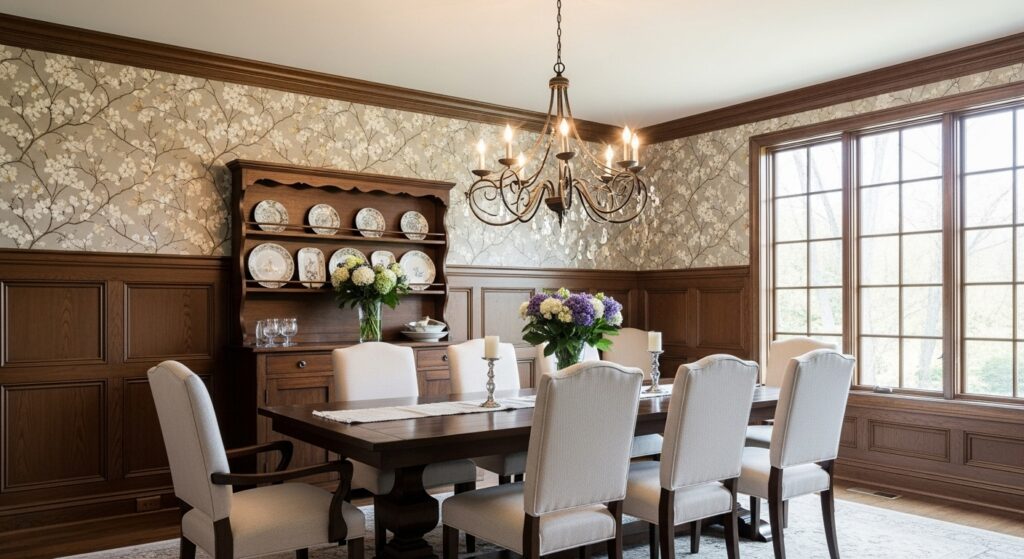 Wallpaper for dining room with wainscoting works best when the lower wall color isn’t an afterthought. Painted paneling reflects light upward. That reflected color changes the wallpaper tone subtly but constantly.