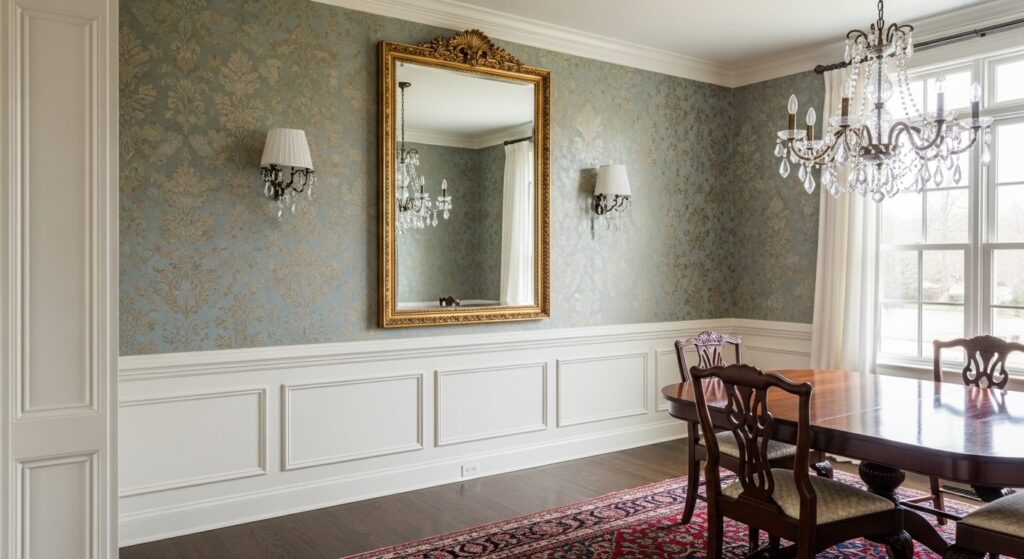 Market data from renovation surveys shows homeowners are less likely to regret wallpaper choices when wainscoting carries the visual weight. The wallpaper becomes atmosphere, not focal point. That’s safer long-term.